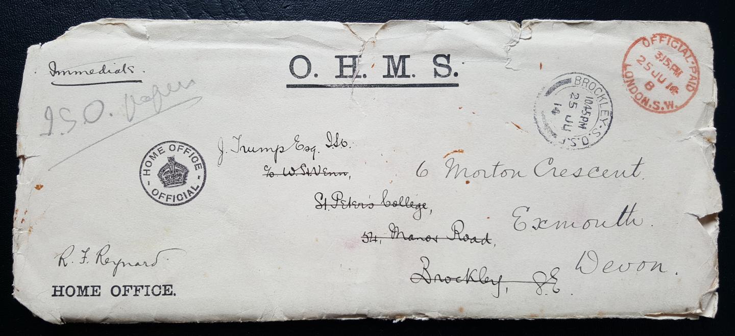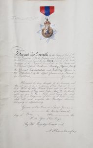 The first Secretary and Registrar of the Order was Charles Defell, who retired in 1904 to be replaced by Robert Froding Reynard, a Clerk in the Home Office. Reynard administered the Order for 22 years until his death in 1926, so he was not able to advise when the warrant was reviewed pursuant to the change of Royal Titles in 1927. The reviewer concluded that: “There can be little doubt that the inclusion of this coloured representation in the Imperial Service Order Warrant adds greatly to the cost of printing the form and it is questionable whether it adds anything to the appearance or importance of the document.” (TNA: HO 144/22300 refers). So the badge was removed and replaced by the blind stamped seal of the Home Secretary. At the same time the warrant was printed on a single (rather than folded) sheet. The reviewer failed to notice that other warrants had the Court location, St James’s, printed on them so the revised ISO warrants continued to require the “Court at” to be completed manually.