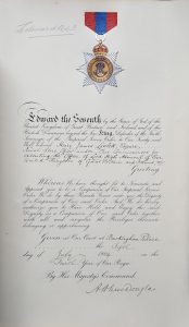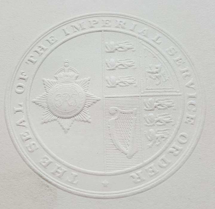 Some real thought seems to have been put into the design of the warrants of appointment. At the time, warrants for the other Orders were printed on two sides of a folded piece of foolscap paper. The ISO retained the four sided warrant, but it was much larger than foolscap and was printed on the first side only. Rather than the simple black and white design of the other Orders, the ISO followed the Order of St Michael and St George and included a coloured image at the head of the warrant. However, instead of the small image of the saints, the ISO used an embossed, bold image of the badge of the Order, in full colour and gilt. The warrant was sent out rolled in a tube, so perhaps it is not unreasonable to suppose that it was thought that recipients might be proud enough frame their warrants for all to see, which was not easily done for other warrants.
