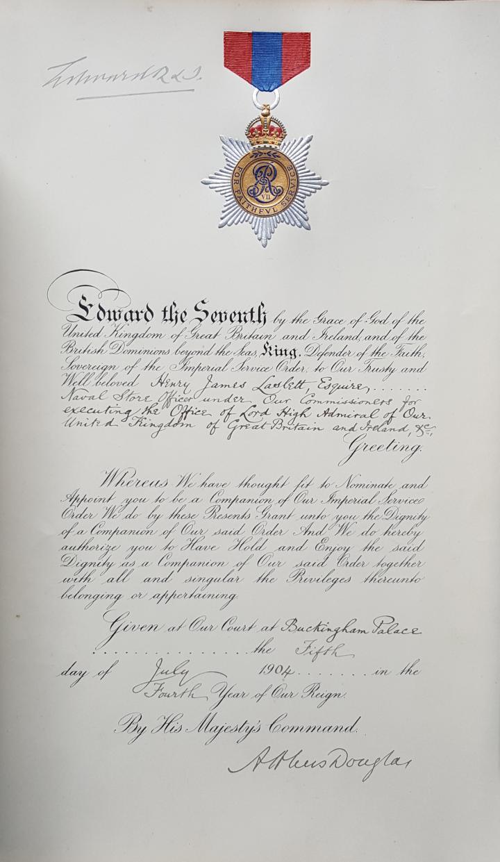 Laslett’s warrant gives a florid description of his role as, “Naval Store Officer under Our Commissioners for executing the Office of Lord High Admiral of Our United Kingdom of Great Britain, Ireland &c.” whereas the London Gazette merely states that he is,” Naval Store Officer at Chatham.” He was awarded the ISO in 1904.