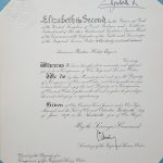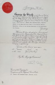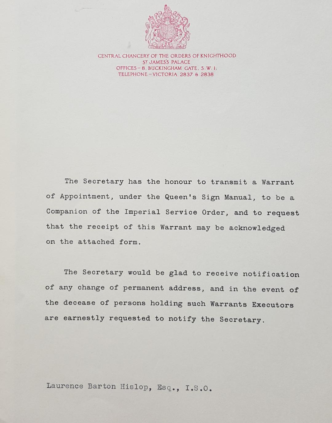 The last example of the type of warrant described above, that I have seen is dated 1937 (see EJL Slynn, below). The next warrant that I have seen is dated 1948 and this is in the current style (for an example see LB Hislop, below), so at some stage between these dates the warrant changed. It is tempting to think that this might have occurred pursuant to the 1938 revision of statues and the Central Chancery taking over the administration of the Order in October of the same year, but I have no proof for this.