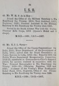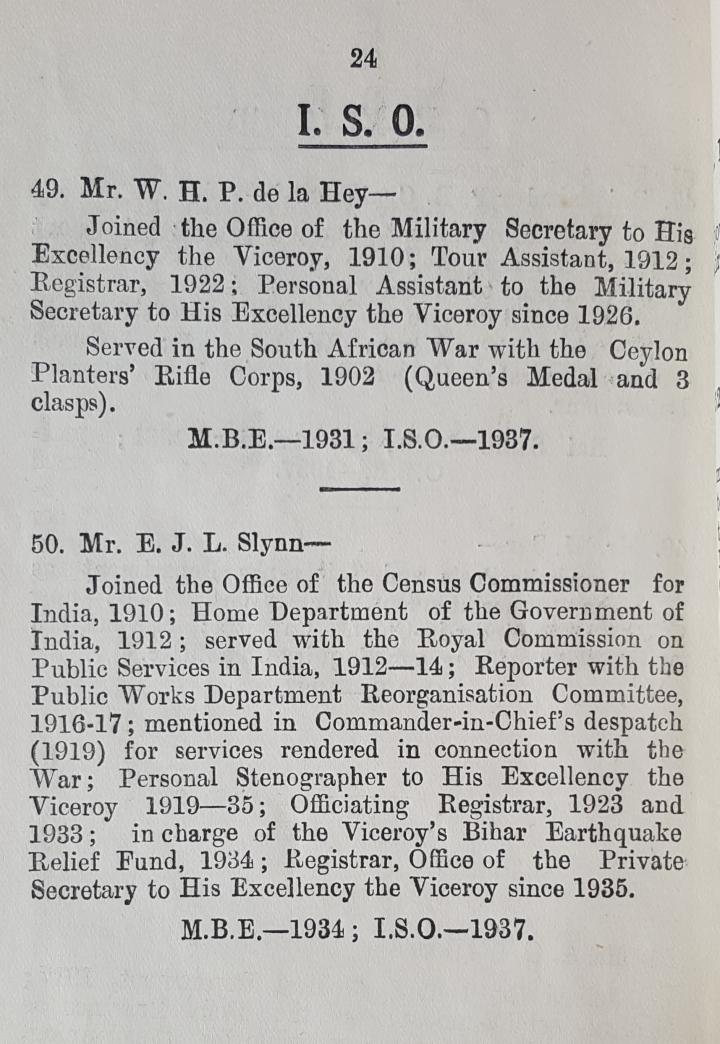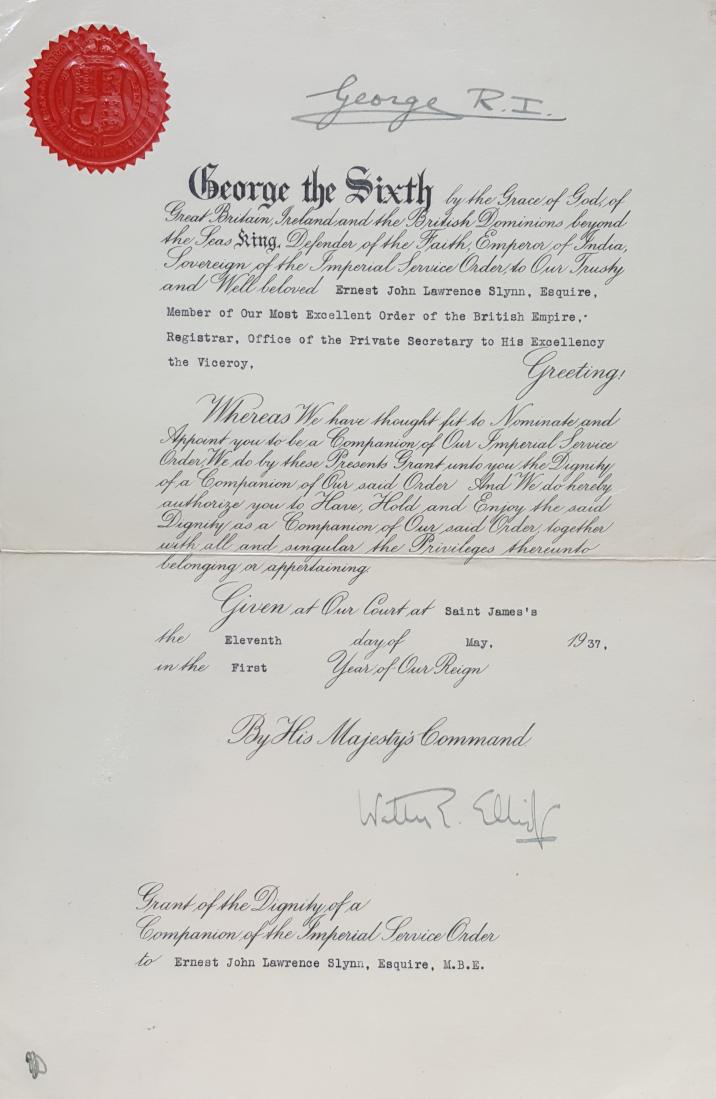 Slynn was invested with his ISO by the Viceroy in 1938. Investitures held in India at this time were accompanied by a small booklet with biographical details of those being invested.