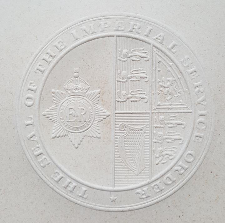 In the 1938 revision of the statutes, the Order was brought into line with other Orders by getting its own seal. The statutes describe the seal in heraldic terms as: Gules, a representation of the Badge of the Order impaling Our Royal Arms, with the following inscription “The Seal of the Imperial Service Order.” The ISO is unusual in that it is the only Order which includes the current sovereign’s cypher on the obverse of the insignia. This means that when the cypher changes, it is necessary to change the seal as well. Thus there have been three different seals which the cyphers GRI (1938-47), GVIR (1948-52) and EIIR (1952 to date). Historically St Edward’s Crown has been used during the reign of a Queen Regnant and the Tudor Crown for Kings Regnant, so shortly after becoming Queen, Her Majesty directed that St Edward’s Crown should replace the Tudor Crown in all future designs embodying a representation of the Crown. The change was not effected on the design of the ISO badge until about the 1990s. Despite this, the seal of the Order continues to use the badge with the Tudor Crown.