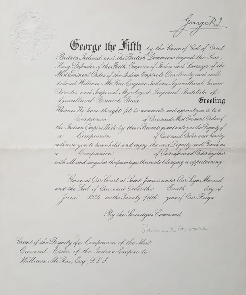 McRae was a member of Indian Agricultural Service and Imperial Mycologist at the Imperial Institute of Agricultural Research, Pusa. He was awarded the CIE in the 1934 Birthday honours. The Efficiency Medal, India suspension, is named to him as a private in the Bihar Light Horse, Auxiliary Forces India
