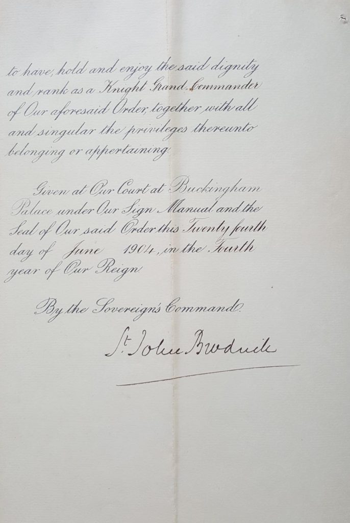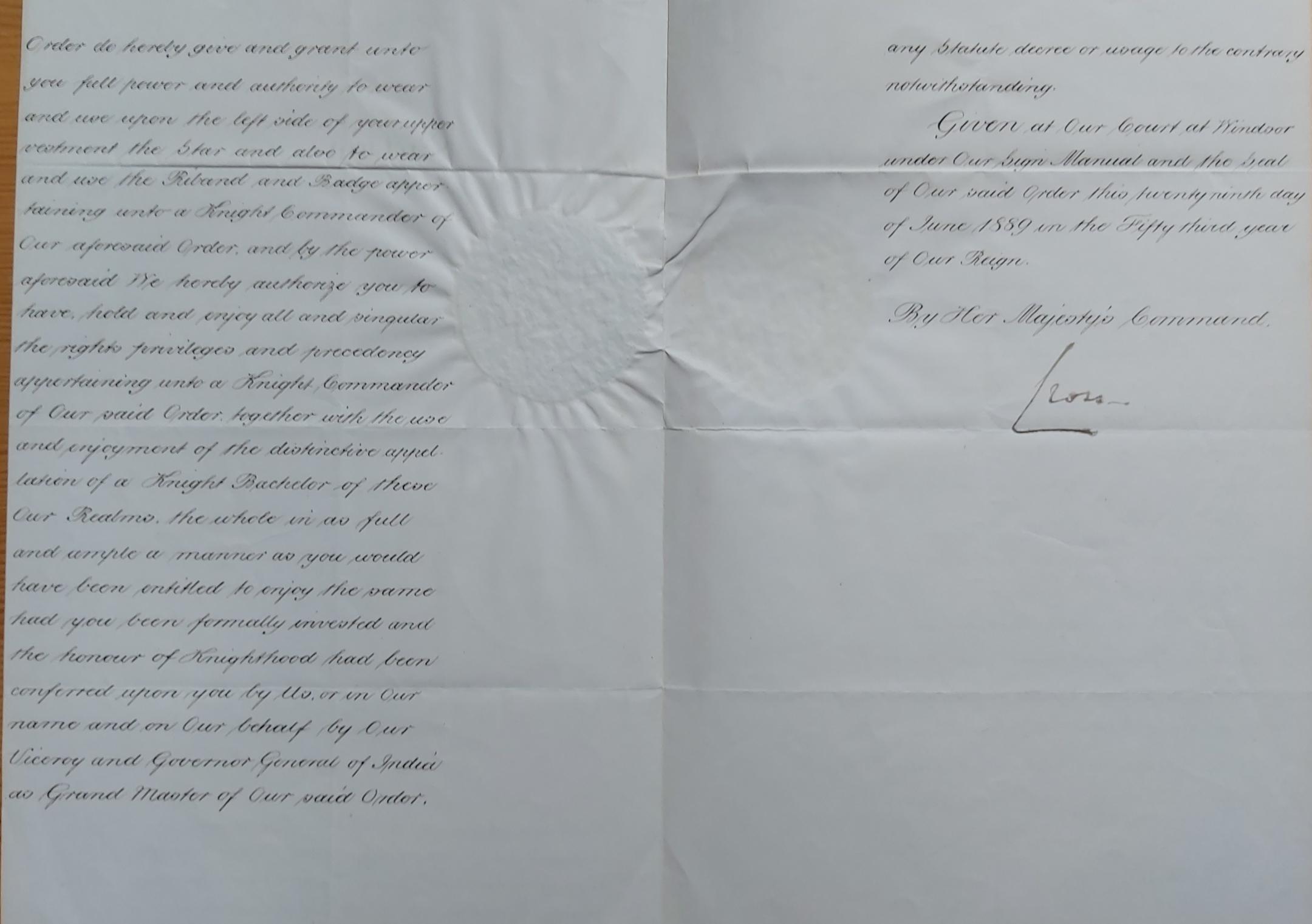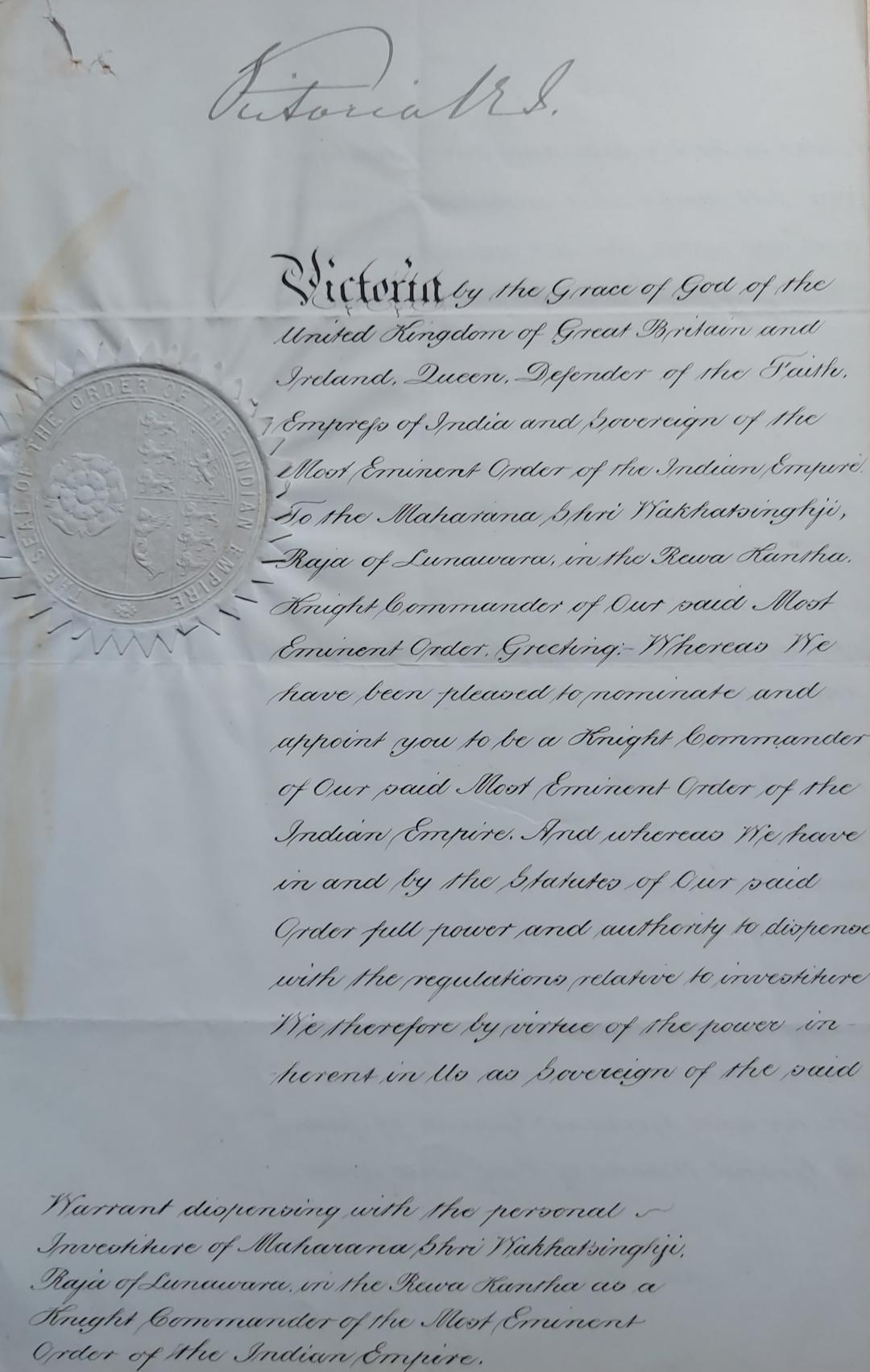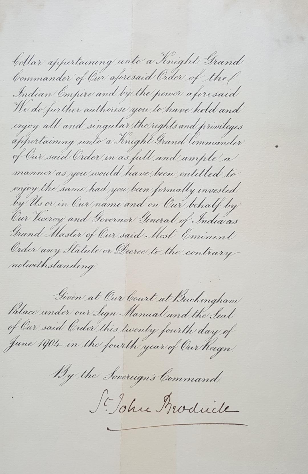 The Raja was appointed KCIE in 1889, because he was unable to attend an investiture, a warrant of dispensation was issued.
