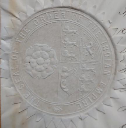 The seal is described in the statutes as: argent a rose gules, barbed vert, impaled with Our Royal Arms, with the following circumscription “The Seal of the Most Eminent Order of the Indian Empire.”