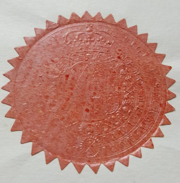 Although the statutes of 1687 describe a Great Seal for the Order, it appears never to have been made. Documents are sealed using a signet which has been in existence since at least 1842, and probably much earlier. It is described as follows: An inch and a half in diameter, and contains a Shield with a Cross of St Andrew, Impaling the Royal Arms of King James the Second as King of Scotland, surrounded by the Collar of the Order, with Badge Appendant, within a circle of the Motto of the Order, circumscribed with the words: Sigill. Secret. Nobiliss, Ordinisi. Cardui.