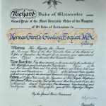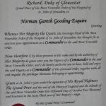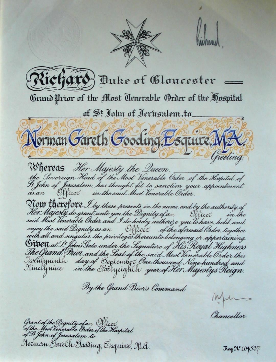Gooding was made an Officer in 1999 and advanced to a Commander in 2014. A considerable amount of calligraphy went into the 1999 diploma – this was the work of Denis Collings. The 2014 diploma is plainer and presumably produced by computer at a much lower cost.