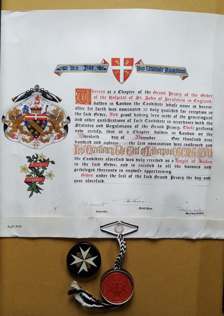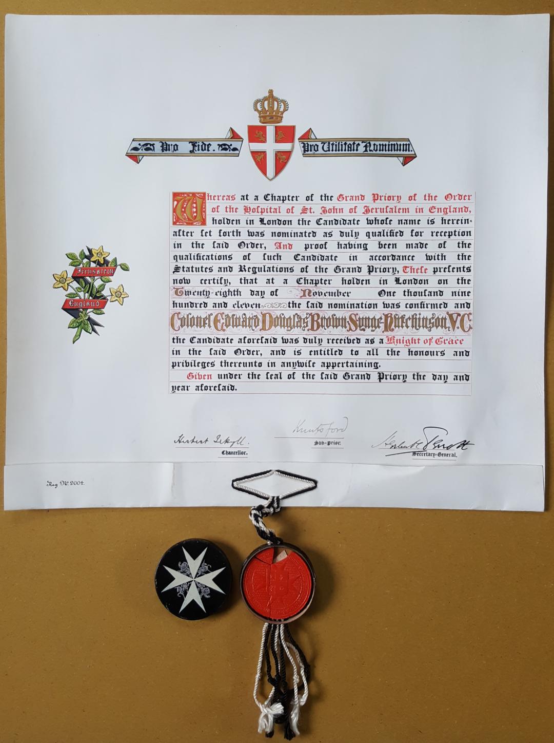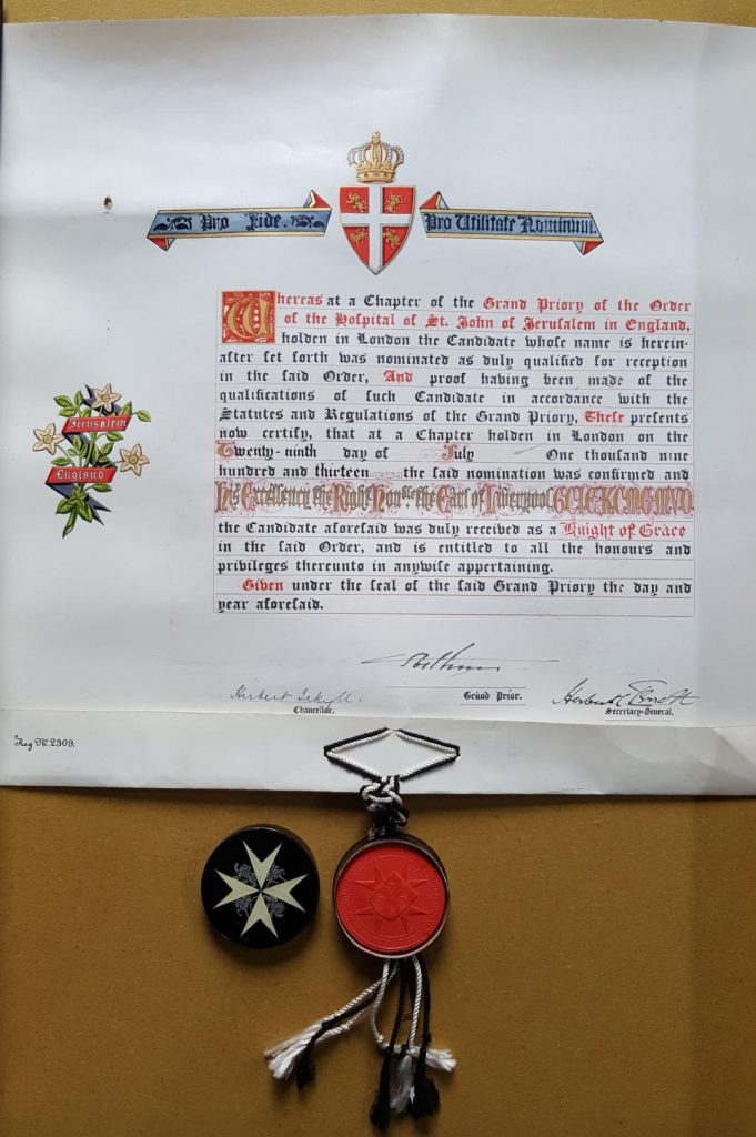 Until at least 1926 for Knights of Justice of the Order, if the recipient had a coat of arms, their diploma included a painting of their coat of arms combined with that of the Order of St John.
