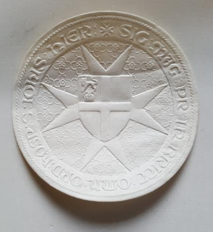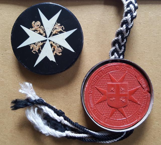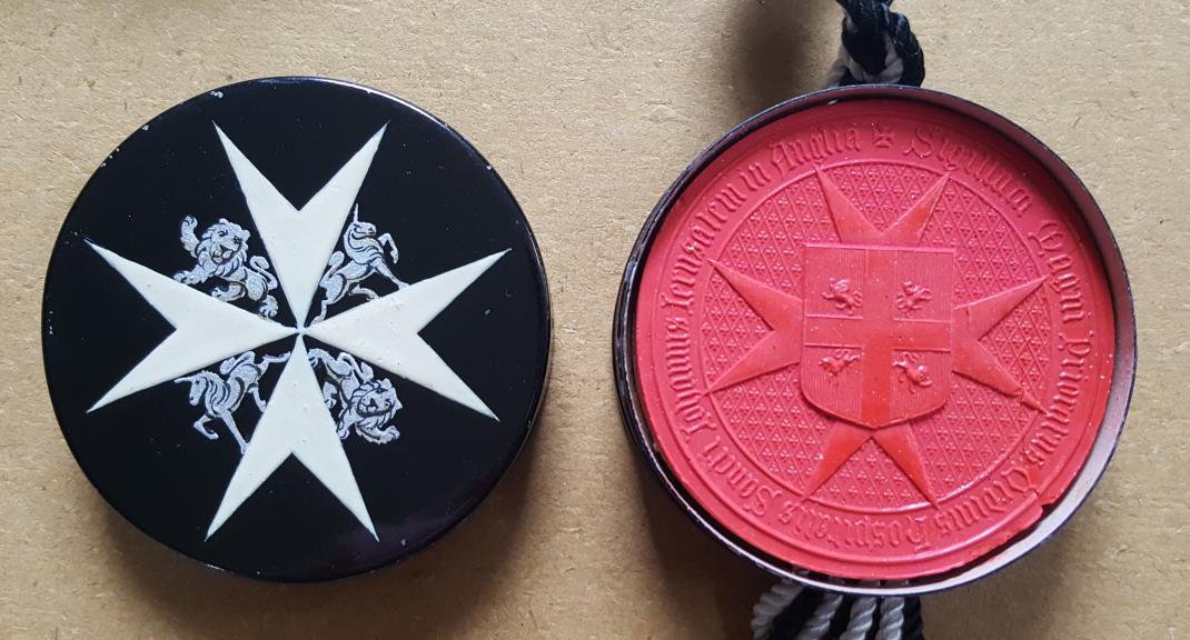 The seal is described as: the Badge of the Order, surmounted by an Escutcheon of the Arms of the Order, the whole surrounded by the legend: “Sigillum Magni Prioratus Ordnins Hospitalis Sancti Iohannis Hierusalem” This may be abbreviated to “Sig:Mag:Pr:Ord:Hosp:S.Iohis:Heir”