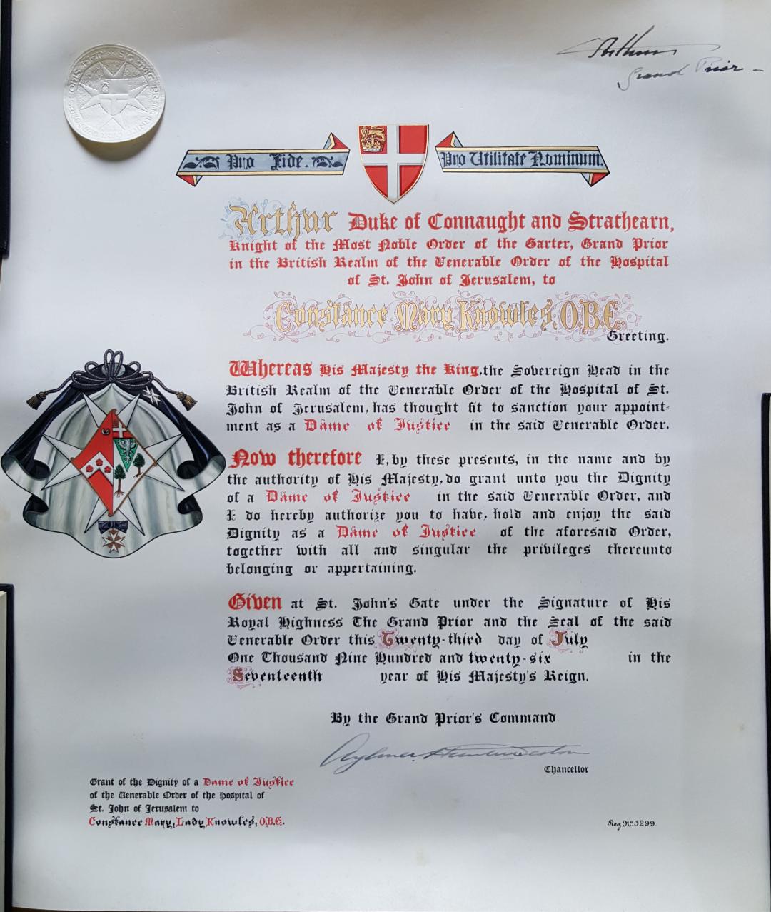 Lady Knowles was appointed a Lady of Grace in 1912 and a Dame of Justice in 1926.