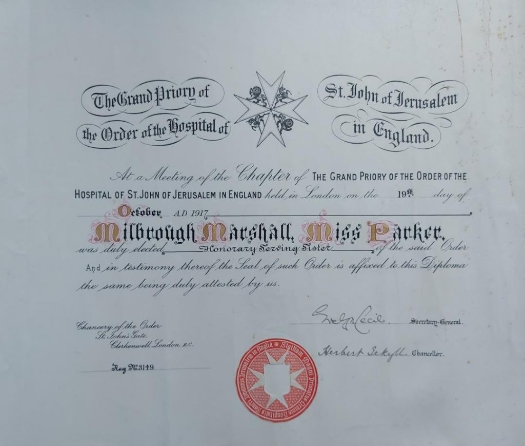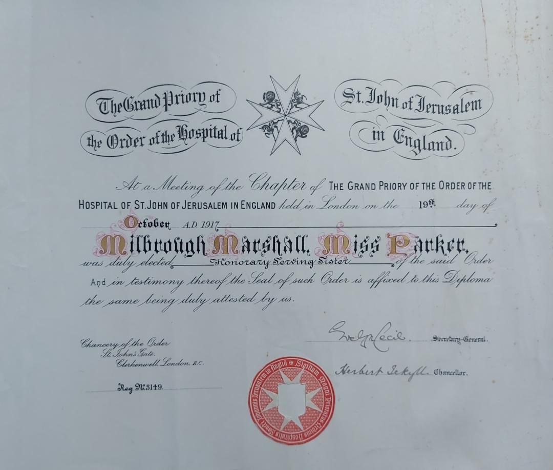 Miss Parker was made a Serving Sister in 1917. Although reasonably decorative compared to official diplomas of the time, it is noticeably plainer than for higher grades of the Order. Please note that, in this example, the arms of St John have been neatly cut out of the seal.